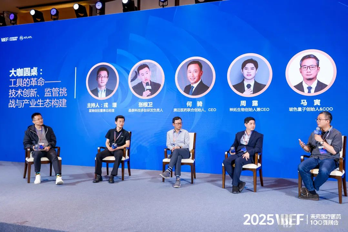 在蓝驰创投董事总经理戎璟主持下,晶泰科技多肽业务高级总监张根卫、腾迈医药联合创始人&CEO何骑、神拓生物创始人兼CEO周露、玻色量子创始人兼COO马寅展开了一场酣畅淋漓的讨论。