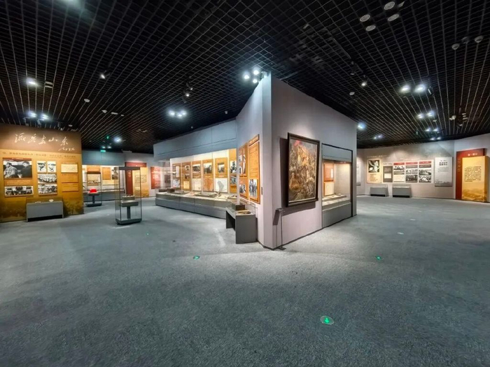 色彩搭配以大地色系奠定历史厚重感,暖黄色射灯模拟煤油灯照明效果,局部冷白光突出文物细节。随着革命推进形势渐入佳境,色调逐渐融入低饱和度红色。最终单元以金色为主调,搭配米色、白色象征希望曙光,通过色彩递进体现革命必胜的信念。