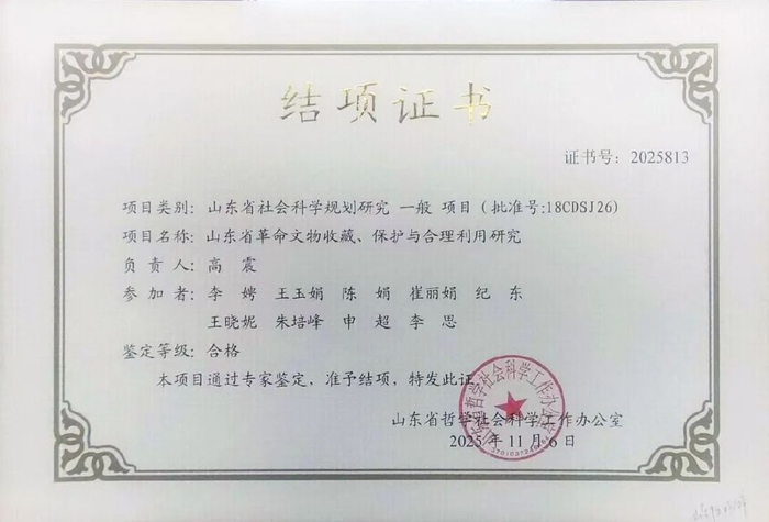 ▶统筹申报国家级、省部级等各类课题共60余项,其中获批立项20项,完成“山东省革命文物收藏、保护与合理利用研究”等省部级课题结项13项,“申报-研究-结项”闭环管理机制进一步完善