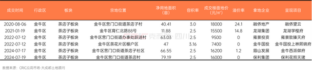从住宅层面来看,整个金牛茶花板块近五年来仅出让6宗涉宅用地,成交楼面价从7400元/㎡至20200元/㎡。板块内也吸引了众多知名房企入驻,龙湖、雍景、融侨、保利、中铁建等,产品打造基本以大平层改善型为主。