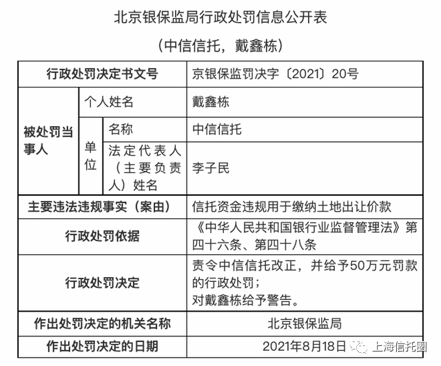 上海信托圈消息,8月24日,北京银保监局公布一则行政处罚信息,中信信托因“信托资金违规用于缴纳土地出让价款”,被北京银保监局责令改正,并给予50万元罚款的行政处罚。