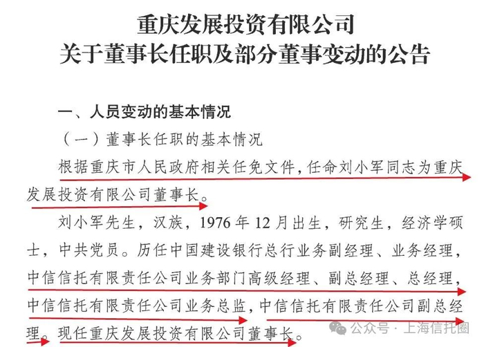 导读:中信信托副总“空降”山城重庆 ,担任“千亿平台”重庆发展投资公司党委书记、董事长!