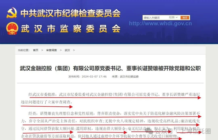2月8日,经武汉市委批准,武汉市纪委监委对武汉金融控股(集团)有限公司原党委书记、董事长谌赞雄严重违纪违法问题进行了立案审查调查。