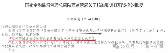 3月11日,陕国投信托风险总监张涛的任职资格获批。