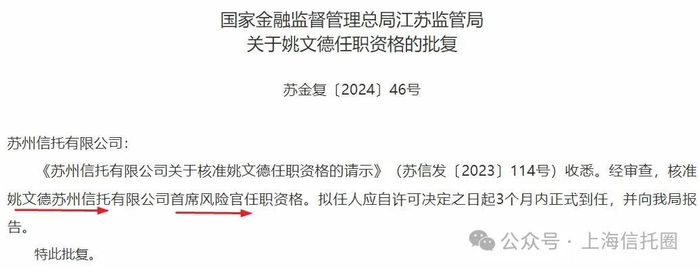 2月8日,苏州信托首席风险官姚文德的任职资格获批。