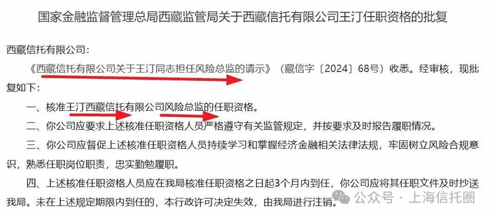 4月15日,西藏信托风险总监王汀的任职资格获批。