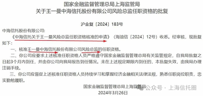 4月2日,中海信托风险总监王一曼的任职资格获批。