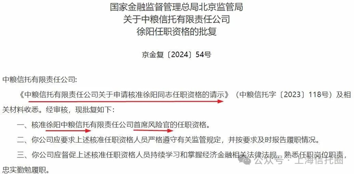1月29日,中粮信托首席风险官徐阳的任职资格获批。