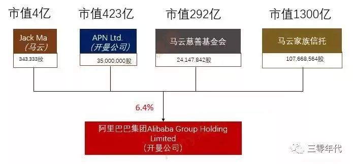 截至2017年底,马云持有阿里巴巴167,159,739股权益,占阿里总股份的6.4%。而马云持有阿里的方式,除占其总持股的0.2%为个人持股外,其余99.8%都是通过海外实体持有的,比如离岸家族信托、海外慈善基金会、开曼控股公司,总价值超过1,700亿。
