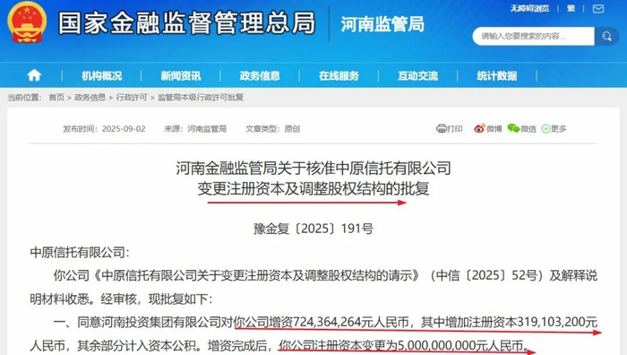 2025年8月29日,河南金融监管局以《关于核准中原信托有限公司变更注册资本及调整股权结构的批复》(豫金复〔2025〕191号):