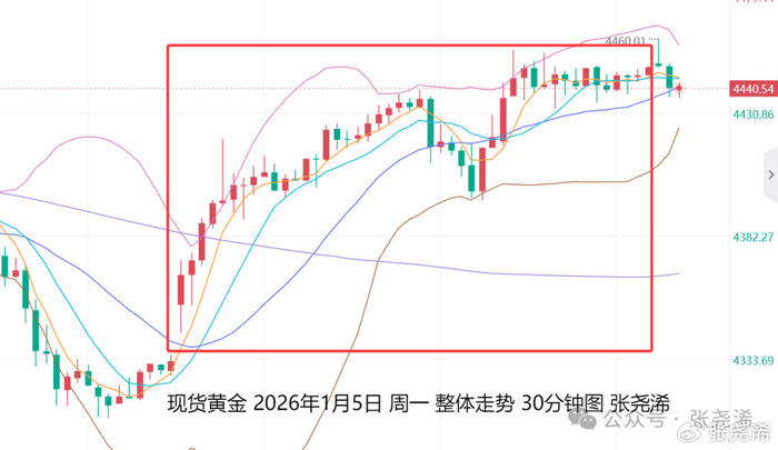 上交易日周一(1月5日):国际黄金随着委内瑞拉局势增强,贵金属的避险吸引力展现,推动金价高开高走,一度站上4450美元关口,创一周新高,并收复上周五回撤幅度,并重新站上10日均线之上,多头动力加强,下方将再度依托5-10日均线支撑进行低多看涨操作,但也需留意缺口回补而进行的跳水走低风险,以及再度的入场机会。