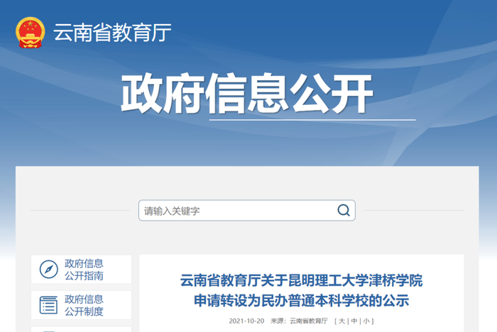 10月20日,云南省教育厅发布《关于昆明理工大学津桥学院申请转设为民办普通本科学校的公示》。