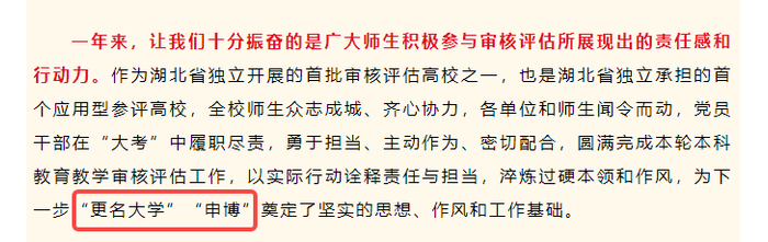在2024年新年贺词中,湖北医药学院就本科教育教学评估工作提到了下一步“更名大学”“申博”事宜。