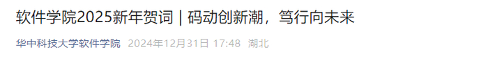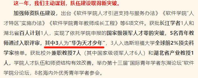 近日,华中科技大学软件学院发布2025新年贺词,对2024年的一系列工作成果做了总结。在贺词中的“主动谋划,队伍建设取得新突破”模块,学院提到:5名青年教师通过入职评审,其中3人为“华为天才少年”,3人入选斯坦福大学全球前2%顶尖科学家榜单。