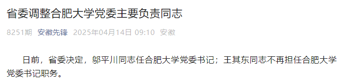 据安徽省委组织部官方公众号“安徽先锋”消息,日前,省委决定,邬平川同志任合肥大学党委书记;王其东同志不再担任合肥大学党委书记职务。