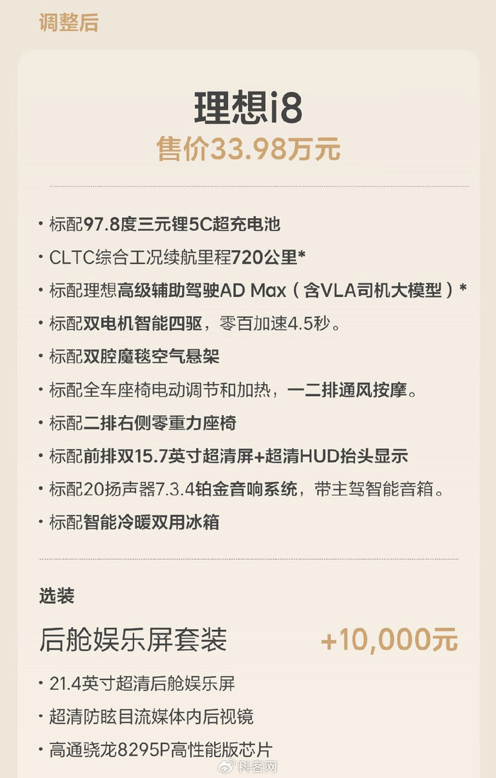调整后的理想i8可以视为原i8 Max版的降价及权益升级,价值1万元的后舱娱乐屏套装可作为选装,包含21.4英寸后舱娱乐屏、防眩目流媒体内后视镜、骁龙8295P芯片三大件,算是弥补了此前i8 Pro和i8 Max的主要槽点。然而此举的代价是i8 Pro车型变相被砍,对于原计划32.18万元入手的消费者而言等同于被毁约,理想官方目前提供的解决方案是退订或升级两种选择,并不涉及毁约赔偿,倘若受影响的消费者后续维权,理想汽车可能会面临新的麻烦。
