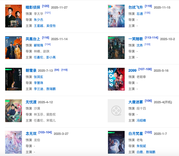对比父亲的铁骨铮铮,李彧其实对自己并没有那么严苛,近几年热播的古偶剧中几乎都有他的身影,光是2025年的作品就有10部之多,如《无忧渡》,《念无双》,《白月梵星》,《朝雪录》,《凤凰台上》等剧。