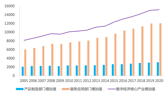 经核算可知,美国数字经济产业增加值规模从2005年的8158.5亿美元增长到15178.3亿美元,复合年均增长率为4.2%;其中,计算机和电子产品制造业增加值从2005年的2112.8亿美元增长到2020年的3108.5亿美元,复合年均增长率为2.6%;信息、计算机系统设计及相关服务业增加值从2005年的6045.8亿美元增长到2020年的12069.8亿美元,复合年均增长率为4.7%。在数字经济产业的内部结构中,计算机和电子产品制造业增加值的规模远远小于信息、计算机系统设计及相关服务业,这说明美国数字经济产业的增长是由服务应用部门主导的。
