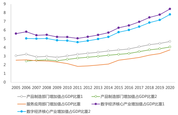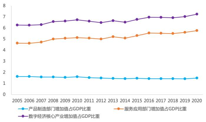 图3 中国数字经济产业及其分行业增加值占GDP比重(2005/2006—2020年)
