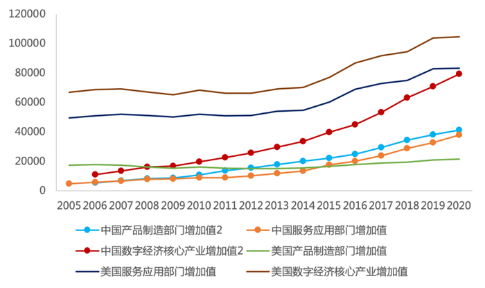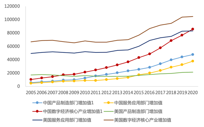 图7 基于倒推法的中美数字经济产业及其分行业增加值比较(2005—2020年)