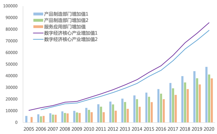 图2 中国数字经济产业及其分行业增加值(2005/2006-2020年)