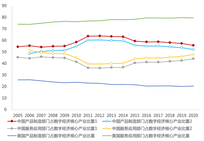 中国和美国的数字经济产业内部结构变迁体现在图8中,由此可见中美两国数字经济产业发展的结构差异特征。第一,美国数字经济产业发展是由服务应用部门主导的,该部门增加值占数字经济产业的比重接近80%;中国数字经济产业则是呈现出两部门的同步发展的特征,产品制造部门占数字经济产业增加值比重略高于50%,服务应用部门占数字经济产业增加值比重略低于50%,总体相差不大。第二,美国数字经济产业内部,产品制造部门与服务应用部门所占比重的差距持续扩大,从2005年的48.2%扩大到2020年的59%;中国数字经济产业内部,产品制造部门与服务应用部门所占比重的差距在2011年以后持续缩小,从2011年的20.6%-27.4%缩小至2020年的4.2%-11.4%。