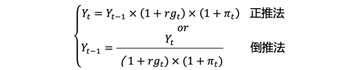 由上可知,无论采用正推法或是倒推法,关键都在于实际增长率和名义增长率之间的转换。根据宏观经济学中实际增长率和名义增长率之间的关系: