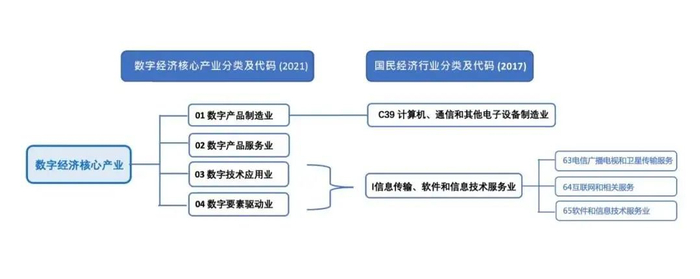 数字经济的发展主要包括数字产业化和产业数字化两部分内容。2021年5月27日,国家统计局公布并实施《数字经济及其核心产业统计分类(2021)》,将数字经济核心产业确定为数字产品制造业、数字产品服务业、数字技术应用业、数字要素驱动业。同时又明确指出,数字经济核心产业对应的四大类即数字产业化部分,主要包括计算机通信和其他电子设备制造业、电信广播电视和卫星传输服务、互联网和相关服务、软件和信息技术服务业等,是数字经济发展的基础。