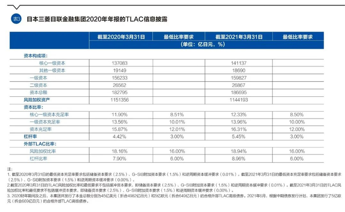 信息披露要求。为提高处置的可信性,强化市场约束,FSB要求G-SIBs定期披露TLAC有关信息。绝大多数G-SIBs(如表3所示的日本三菱日联金融集团)在年报中披露了TLAC监管指标、TLAC工具发行额等信息。