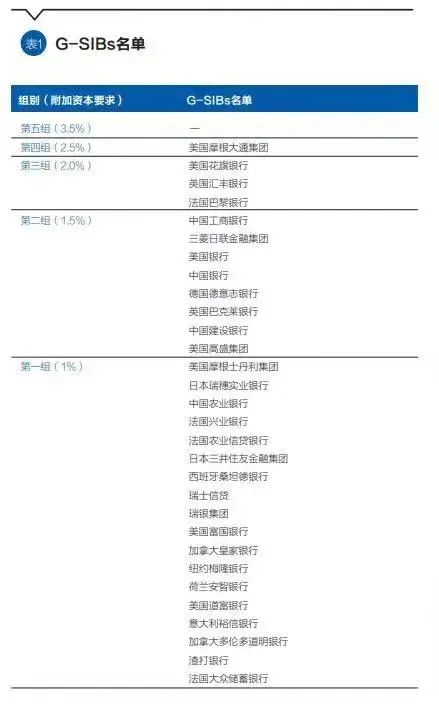 2017年发布的《巴塞尔协议Ⅲ:危机后改革的最终方案》对G-SIBs提出了附加资本和杠杆率等要求。对于第一至第五组的G-SIBs,分别执行1%、1.5%、2%、2.5%和3.5%的附加资本要求,且由核心一级资本满足;附加杠杆率要求是相应附加资本要求的50%,即第一至第五组的G-SIBs分别按照0.5%、0.75%、1%、1.25%和1.75%执行。