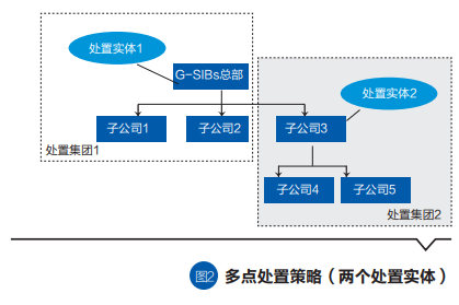 对于业务高度集中在集团总部的G-SIBs,应采取单点处置,这种情况下只有一个处置实体,即G-SIBs总部(如图1所示);对于业务分布较为分散,涉及多个国家或地区的G-SIBs,应采取多点处置,这种情况下有两个或两个以上处置实体,可以是G-SIBs总部或者子公司(如图2所示)。目前,包括我国四家在内的绝大多数G-SIBs采取单点处置,仅西班牙桑坦德银行和英国汇丰银行采取多点处置,如汇丰银行有三个处置实体,包括汇丰控股、汇丰(亚洲)控股和汇丰(北美)控股。