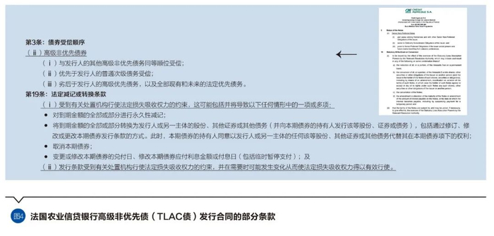 此外,G-SIBs须在TLAC债务工具的发行合同中明确损失吸收条款及在破产处置中的受偿顺序。从我国破产处置法律体系的特点以及银行的经营结构看,我国四家G-SIBs宜参照欧盟有关G-SIBs的发行经验,采用合同约定的方式发行TLAC债务工具,即在发行合同中明确TLAC债务工具的损失吸收条款及受偿顺序,确保其满足TLAC工具标准。如图4所示,法国农业信贷银行发行的高级非优先债(TLAC债)的发行合同中披露了“法定减记或转股”条款,并约定了受偿顺序。