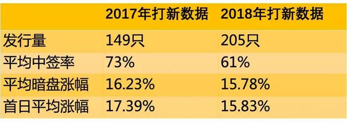 数据显示,18年的港股上市数量远多于17年,中签率虽然略有下降,但仍旧超过50%,其中主板上市130只,一手平均中签率66.7%,创业板新股75只,一手中签率平均51.1%。