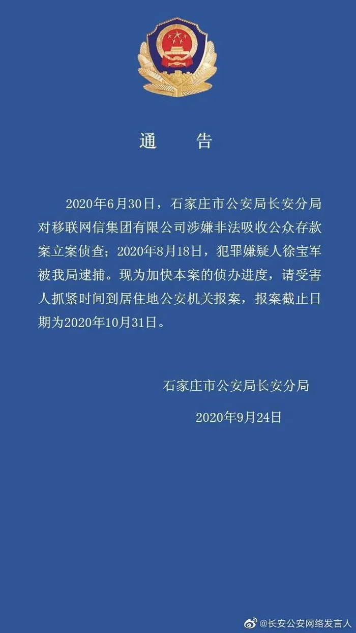 金融虎讯 9月24日消息,今日,石家庄市公安局长安分局发布通告显示,2020年6月30日,对移联网信集团有限公司涉嫌非法吸收公众存款案立案侦查;2020年8月18日,犯罪嫌疑人徐宝军被逮捕。现为加快本案的侦办进度,请受害人抓紧时间到居住地公安机关报案,报案截止日期为2020年10月31日。