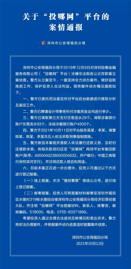 深圳市公安局福田分局持续加大对深圳投哪金融服务有限公司(“投哪网”平台)涉嫌非法吸收公众存款案的侦办力度。