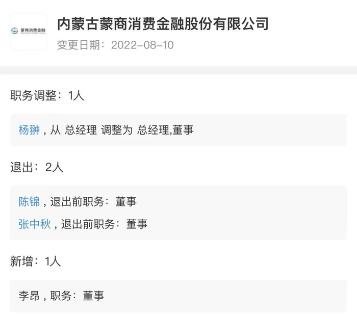 据金融虎网了解,截至2021年末,蒙商消费金融董事会由7名董事组成,共有高级管理人员3名,包括总经理、副总经理及总经理助理。自股权变更后,蒙商消费金融有过多次人事变更。今年3月10日,董事张素梅退出,新增李超然为董事,新增杨翀为总经理。4月14日,蒙商消金监事贺小刚和黄金睿退出,新增杨春雨和董哲接任。6月17日,监事会主席刘玉梅退出,新增李峰接替。