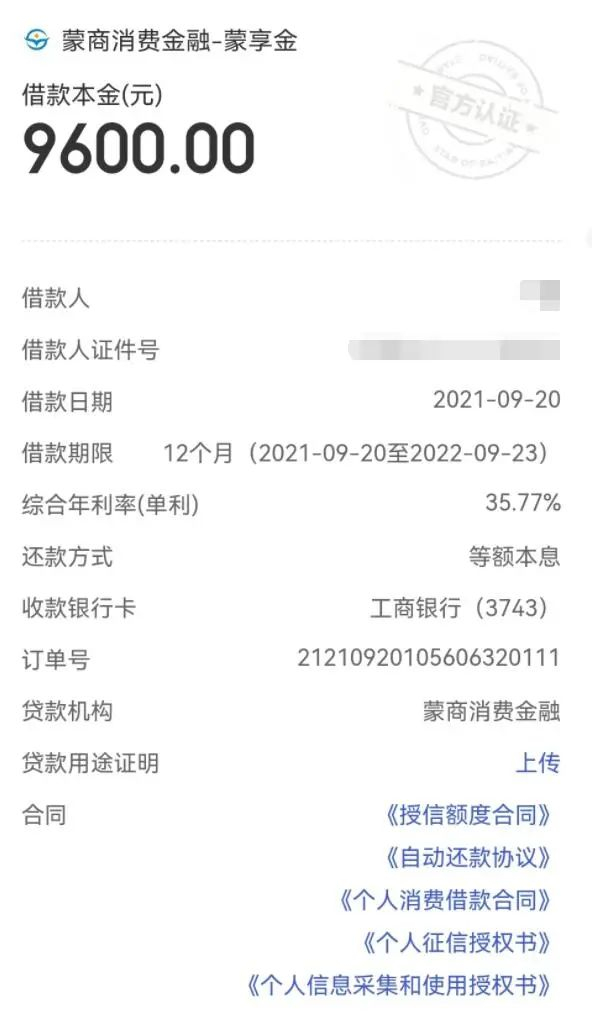 另有用户指出,蒙商消金的年利率已接近36%,从订单号来看,这笔借款的生成日期为2021年9月20日。