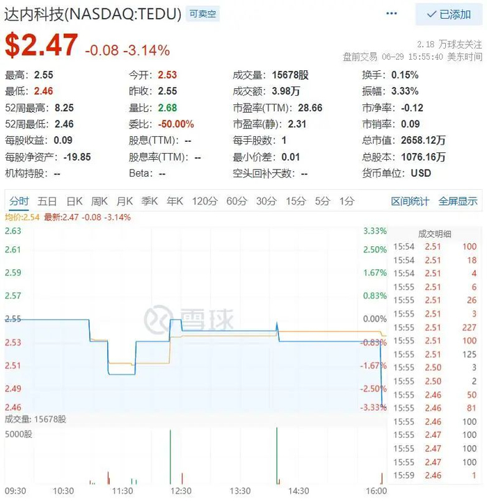 金融虎讯 6月30日消息,昨日晚间,达内科技(NASDAQ: TEDU)宣布,已任命邵小波为首席财务官(CFO),自2023年7月1日起生效。魏平女士因个人原因辞去公司首席财务官一职,不涉及与公司的任何分歧,自2023年7月1日起生效。金融虎网注意到,美股周四,达内科技在纳斯达克股价盘中创下2.46美元的52周新低,收报2.47美元,目前市值2658.12万美元。