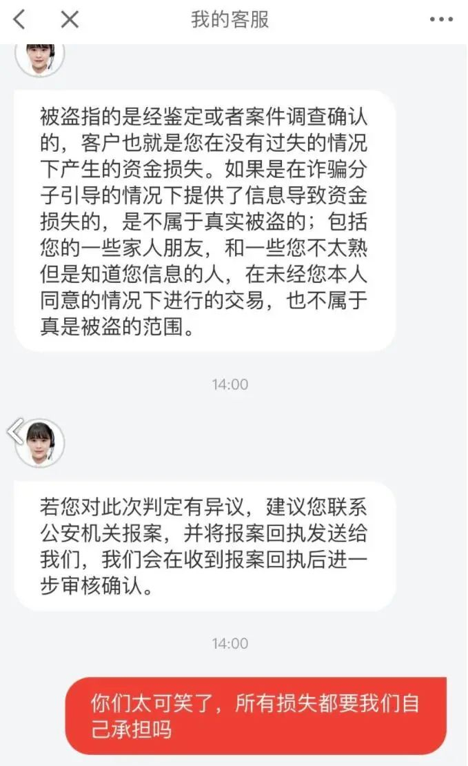从综合信息来看,140条用户有关“盗刷”投诉的内容中,“京东白条、信用卡、个人银行卡”均有涉及。京东金融方面如何认定“被盗”。金融虎APP注意到,据一名投诉用户提供的与客服的沟通对话截图显示,京东金融客服表示:“被盗指的是经鉴定或者案件调查确认的,客户也就是您在没有过失的情况下产生的资金损失。如果是在诈骗分子引导的情况下提供了信息导致资金损失的,是不属于真实被盗的;包括您的一些家人朋友,和一些您不太熟但是知道您信息的人,在未经您本人同意的情况下进行的交易,也不属于真实被盗的范围”。这名客服还强调:“若您对此次判定有异议,建议您联系公关机关报案,并将报案回执发送给我们,我们会在收到报案回执行进一步审核确认。”。