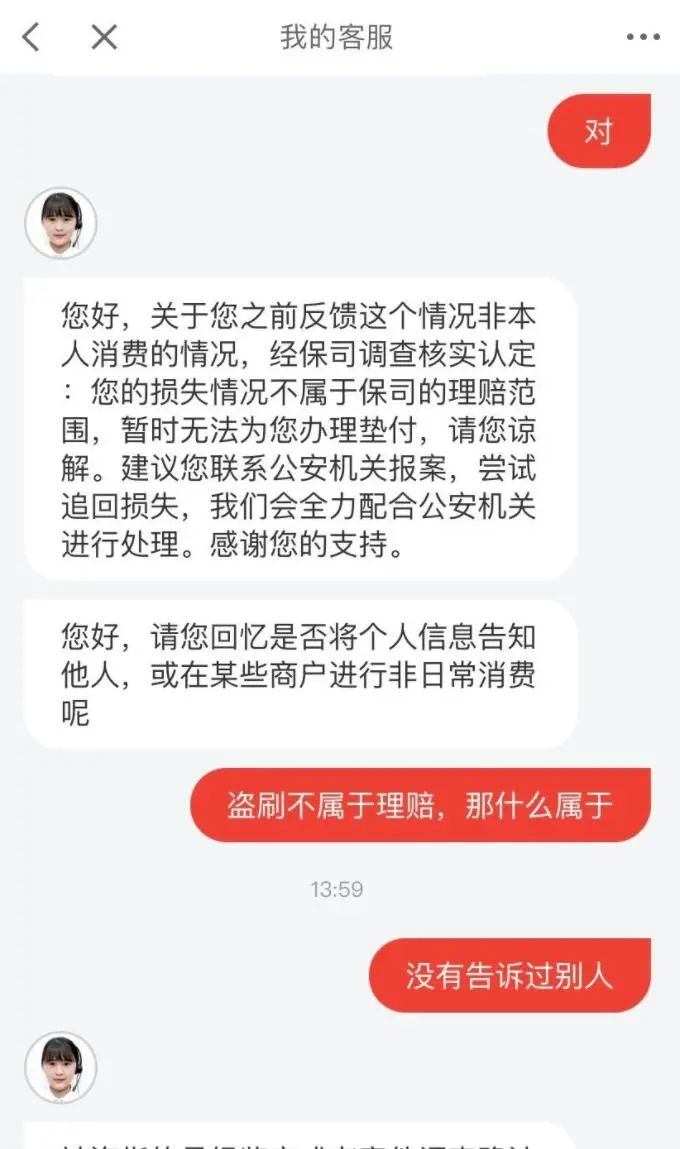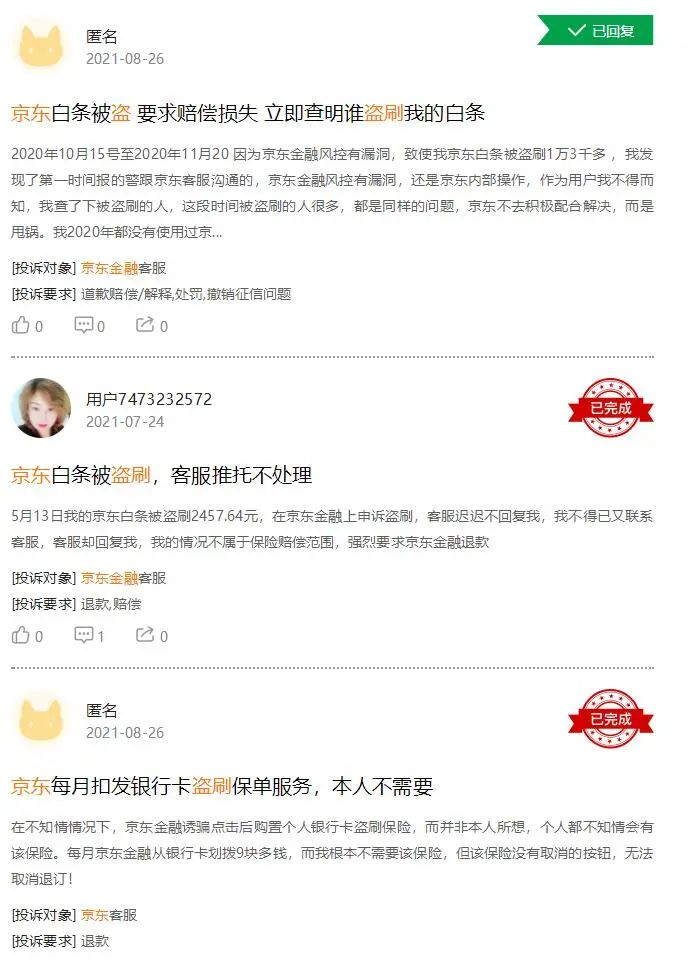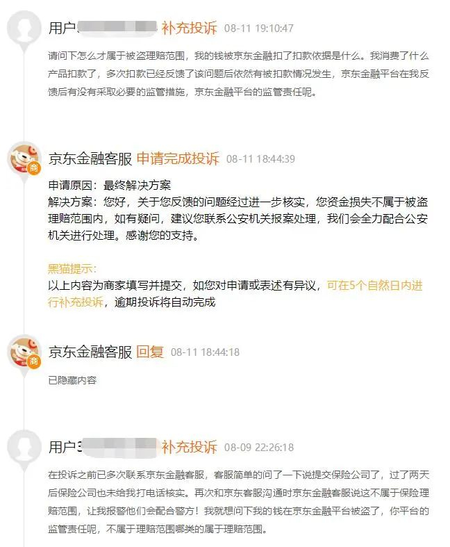 今年8月11日,有用户投诉称,其在京东金融绑定的银行卡多次被不知情扣款,在京东金融平台投诉后未解决。京东金融方面的回应亦是:“经过进一步核实,您资金损失不属于被盗理赔范围内,如有疑问,建议您联系公安机关报案处理,我们会全力配合公安机关进行处理。”。该用户的质疑是:“请问下怎么才属于被盗理赔范围,我的钱被京东金融扣了扣款依据是什么。我消费了什么产品扣款了,多次扣款已经反馈了该问题后依然有被扣款情况发生,京东金融平台在我反馈后有没有采取必要的监管措施,京东金融平台的监管责任呢?”。