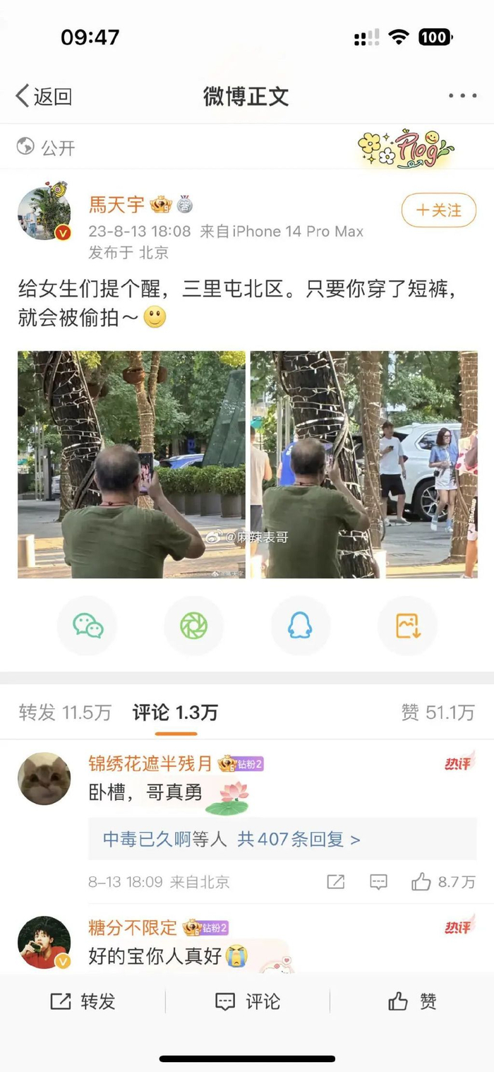 现在的明星其实都不太敢于对社会现象发声,因为一旦说错了话,做错了事,那么不仅对他们的口碑会造成一定的反噬,而且也会让他们的路人缘大幅下跌。所以现在明星们基本上都明哲保身,官方账号都选择更为保险的工作人员代为营业,自己很少在上面说真话讲真事,这也是内娱明星们经常被人吐槽没人味儿的原因。不过最近马天宇在自己的主页发布了一条动态,他拍摄了两张图片,图片中是一个秃头的大叔正在竖起手机,似乎是在偷拍远处路过的女生。马天宇还配文提示称:“只要你穿了短裤,就小心被偷拍”,也是希望女生们小心注意,在公共场合也要保护好自身安全。马天宇本人是好心,但是既然是明星利用自己的公共影响力去对这个大爷的“偷拍”行为进行批判,那么可能就要面对更多人的审视。不少人根据马天宇发布的图片,将大爷手机里的画面放大,发现大爷似乎正在刷短视频,能够看到点赞收藏的按钮,并不是在针对远处的女生进行偷拍。还有人质疑马天宇在发布这两张照片的时候,是否有进行过相关求证,而且他如果真的想杜绝偷拍这种行为,为什么还要用偷拍去制止偷拍。只能说明星要妥善利用好自己的流量,不管是真实发声,还是哗众取宠立人设营销都要慎重。