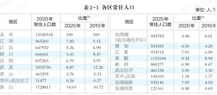武汉全市15个区(含功能区)中,常住人口超过100万人的区有3个:黄陂区、武昌区、洪山区;在50万人至100万人之间的区有9个:江岸区、江汉区、硚口区、汉阳区、东西湖区、蔡甸区、江夏区、新洲区和东湖高新区;少于50万人的区有3个:武汉经济开发区、东湖风景区和青山区。其中,常住人口居前四位的区合计常住人口占全市常住人口比重为40.14%。