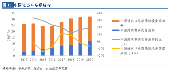 电商渠道增速强劲,在跨境行业重要性日渐提升。跨境电商行业凭借较强的成长性,逐步成为我国进出口贸易支柱产业。在我国消费者对进口商品庞大的需求叠加我国生产端对比海外的明显优势作用下,我国进出口额持续增长,2020年达到32.16万亿元的规模,2015-2020年五年复合增长率为5.55%。