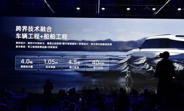 除了能轻易秒杀布加迪的动力,新车还真正具备了水陆两栖功能,在吃水深度上,它可以达到1.05米,整舱的防水等级达到了IPX8级别,且涉水部位采用了船舶级的防锈处理。但不同于仰望U8的深度涉水,捷途纵横还可以真正当船开,采用涡轮推进器+四轮驱动后,车辆的满载排水量达到了4吨,并且能够以4.5节的最大航速,航行40分钟,所以这套动力系统,名副其实的被称之为纵横两栖黄金增程CEM-O。