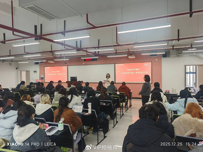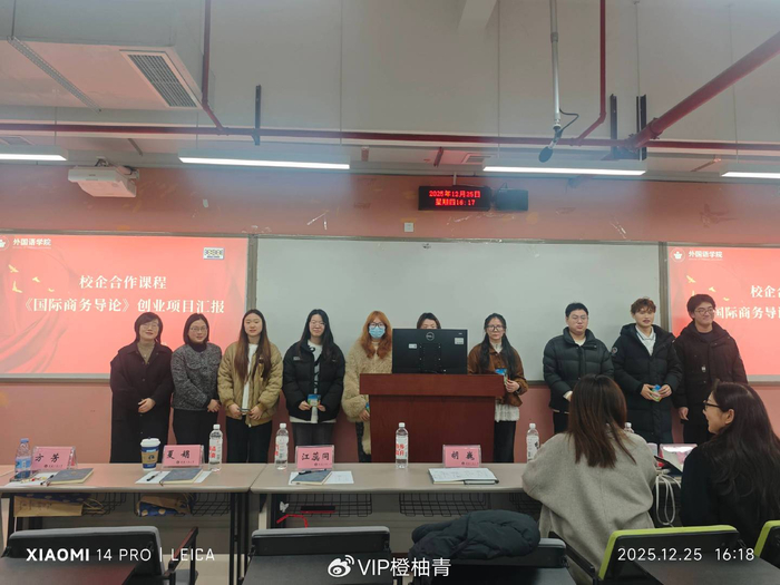 2025年12月25日,重庆工商大学涵智楼1108教室内气氛热烈,一场以“理论赋能实践,校企共育新商才”为主题的《国际商务导论》课程结课汇报活动在此盛大召开。重庆橙柚青网络科技有限公司总经理胡巍作为校企合作企业代表受邀出席,与重庆工商大学国际商学院师生共同见证课程成果,共探产教融合新路径。
