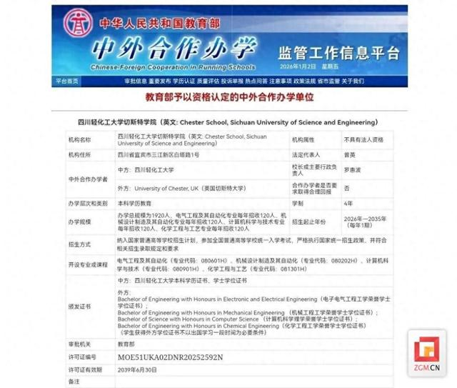 受访方供图据悉,英国切斯特大学成立于1838年,是英国历史悠久的综合性公立大学之一,教学质量卓越,师资力量雄厚,在多类权威评选中位居前列。新设立的切斯特学院紧密对接国家与区域发展战略,首批开设电气工程及其自动化、机械设计制造及其自动化、计算机科学与技术、化学工程与工艺4个本科专业,采用“4+0”双学位培养模式。学生四年在校学习,满足双方毕业及学位授予条件后,可同时获得四川轻化工大学本科毕业证书、学士学位证书以及英国切斯特大学的荣誉学士学位证书。