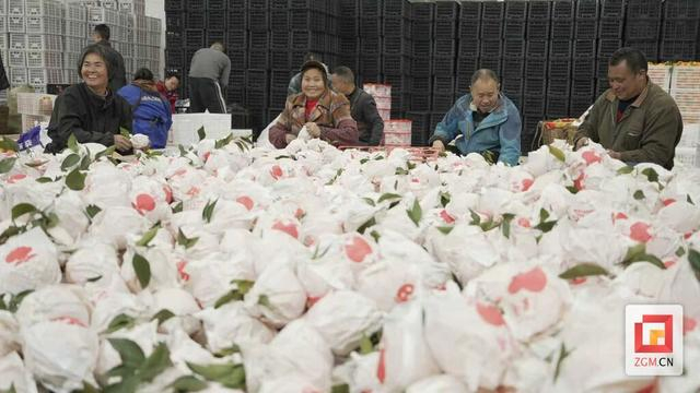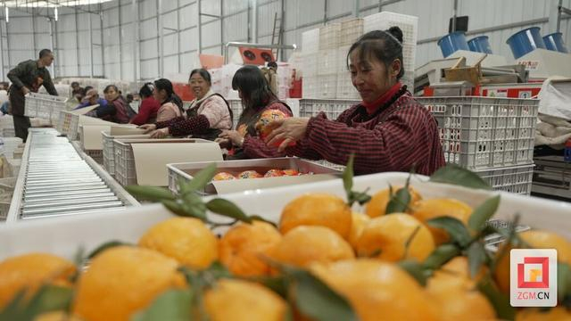 转运车将新鲜柑橘送往园区现代化分拣车间。宽敞的厂房内,成筐的柑橘堆成小山,工人们围坐其间,熟练地给果实套上保鲜袋。另一侧,工人们分工协作,有的清洗果身浮尘,有的按大小、品相将果实分为优质果、大果、小果,分拣完成的柑橘被迅速装箱,由工人接力搬上大型货车,满载“甜蜜”的车辆随即奔赴重庆、成都、山东、新疆等地市场。“这果子品相好、口感甜,经过套袋分级后能卖出好价钱,我们一天能装十几车!”分拣车间里,忙着打包的村民脸上笑意满满。