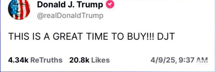 不止懂王自己赚钱,他的女婿库什纳控制的基金,也被发现通过做空苹果和特斯拉股票,至少获利57亿美元。至于相关收益的流向,更是据称已通过加密货币完成了洗白。更离奇的是,就在昨夜懂王官宣赦免小弟90天关税前一刻,他直接发帖称,没有比现在更适合买进“DJT”的时候了,而DJT正是懂王自己公司的股票代码。