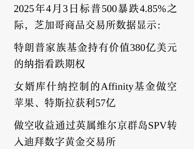 有明确数据显示,在4月3日懂王宣布“关税核战”之前,特朗普家族基金已持有高达380亿美元的纳指看跌期权,这玩意说白了就是“做空美国”,纳指跌的越狠,他就越赚钱。光是美股4月3日暴跌当天,特朗普家族持有的看跌期权盈利就达到惊人的150-220亿美元之间,更不用说之后的多轮美股暴跌,懂王家族可说大发国难财。