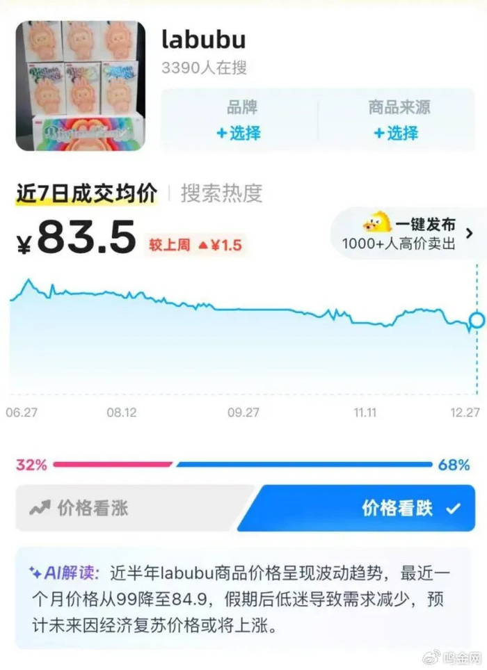 这几天崩的是labubu4,不少人原价99入手,还想着能倒手赚点回来,没想到直接砸手里了,原价都没人收,市价已经跌到83块。